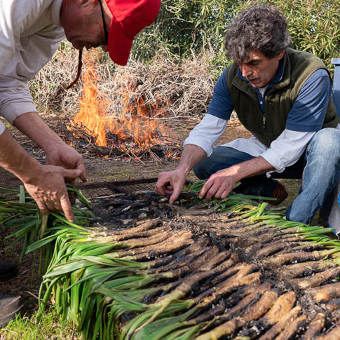 Calçots sind eine Art Frühlings- bzw. Lauchzwiebeln, die auf einem Rost über dem offenen Feuer unter mehrmaligem Wenden gegaart werden, bis die äußerste Haut schwarz verkokelt und das Innere zart-weich ist. Francis, der das Restaurant Can Cires zusammen mit seiner Frau Victoria führt, schwört beim Feuer auf das Holz von Weinreben der Hochebene rund um Sant Mateu. Sind die Caçots nach etwa 20 Minuten gar, werden sie zum nachgaren in Zeitungspapier eingewickelt und dann stilecht auf halbrunden Dachziegeln zusammen mit der groben, würzigen Salvitxada-Sauce serviert, die aus Paprika, Tomaten, Knoblauch, Mandeln, Olivenöl und verschiedenen Gewürzen zubereitet wird.